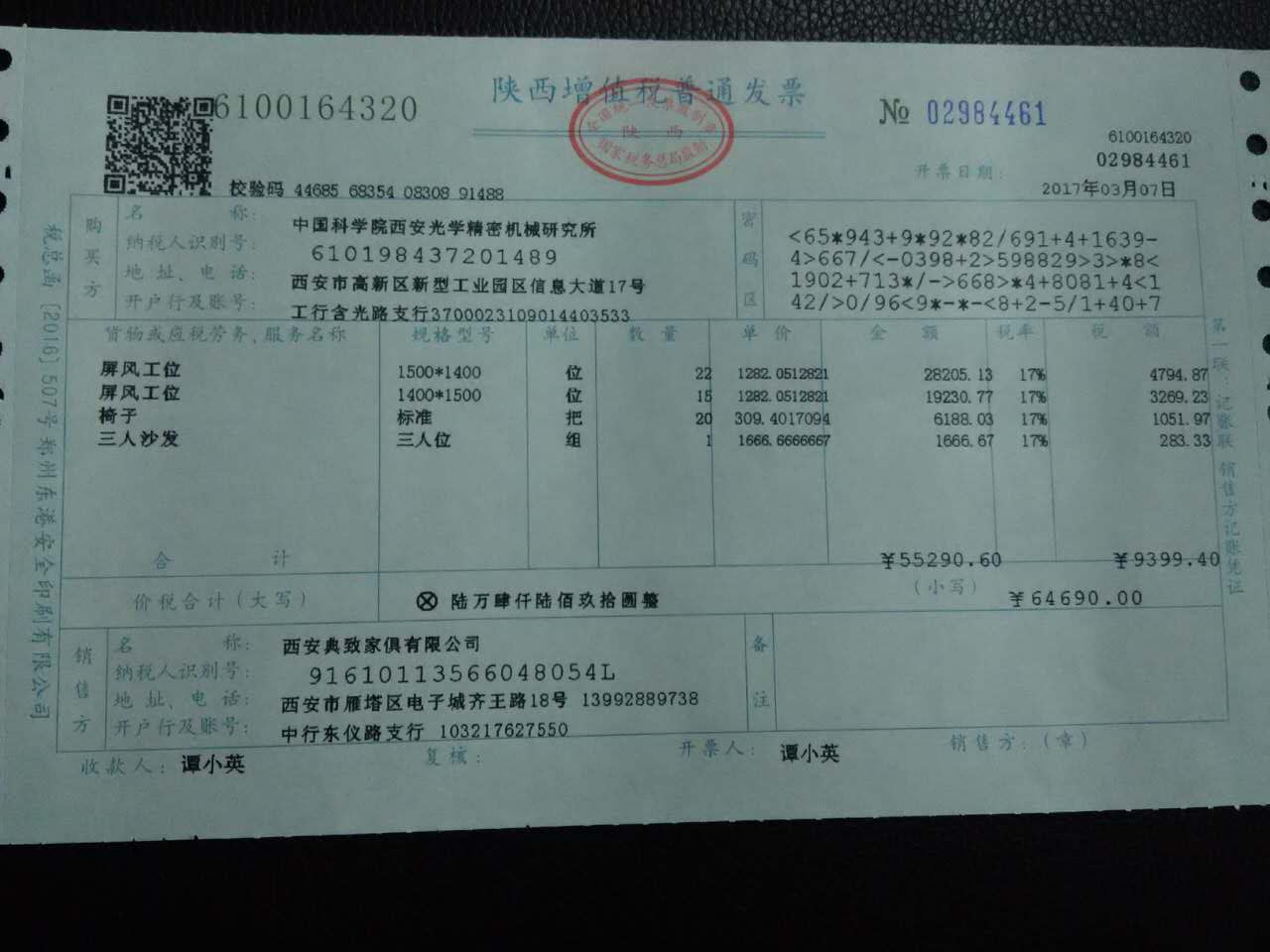 這是典致家具為中國科學院西安光學精密機械研究所開具增值稅專用發票。